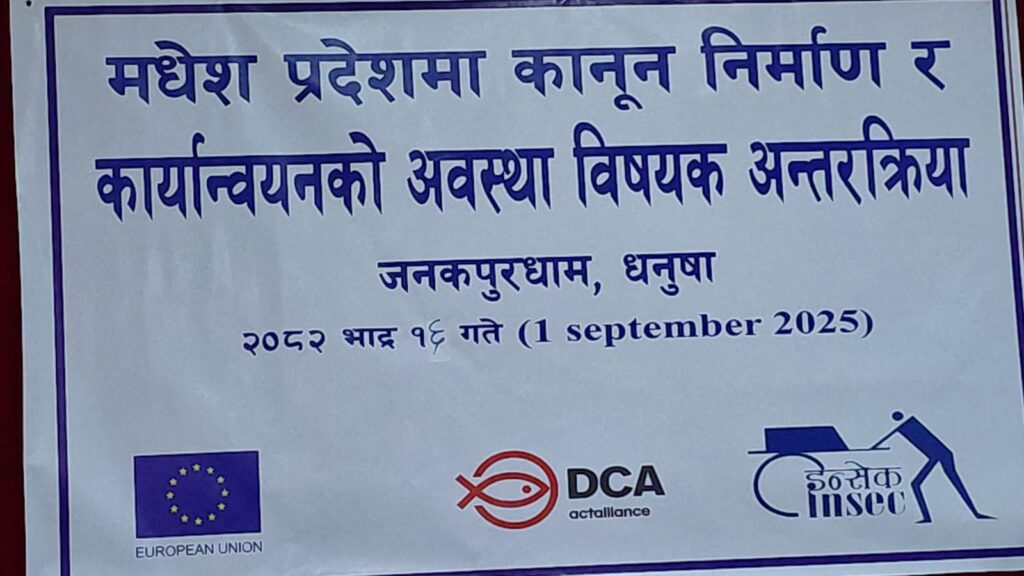 अनौपचारिक क्षेत्र सेवा केन्द्र (इन्सेक) मधेस प्रदेश कार्यालयको आयोजनामा ०८२ भदौ १६ गते मधेस प्रदेशमा कानून निर्माण र कार्यान्वयनको अवस्था विषयक अन्तरक्रिया कार्यक्रममा समय अनुकूल ऐनहरुमा संशोधन गर्नु आवश्यक रहेको मधेस प्रदेश सरकारका गृह, सञ्चार तथा कानून मन्त्री राजकुमार लेखीले बताउनु भयो ।